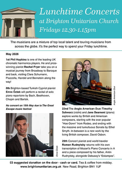 To receive updates by email about our Friday lunchtime concerts, including changes to performers, dates, times or programmes, plus occasionally other performances or events which may be of interest to you, please email buc@brightonunitarian.org.uk and ask to be added to our lunchtime concert email list. These emails are usually sent out no more than 5-6 times per year